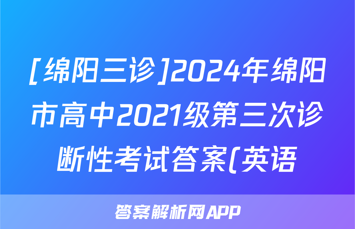[绵阳三诊]2024年绵阳市高中2021级第三次诊断性考试答案(英语)正在持续更新,目前2024-2025英语周报答案网为大家整理了相关试题及答案,供大家查缺补漏,高效提升成绩。